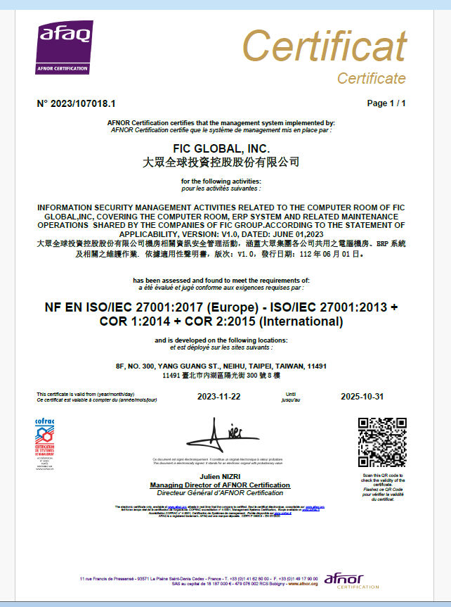 在2023年由领导力企管专业顾问辅导下,大众投控顺利取得 ISO 27001认证,完成信息安全管理系统(Information Security Management Systems)教育训练(Training)、系统建置(Implementing)、外部稽核验证(Certification),落实ISO流程。