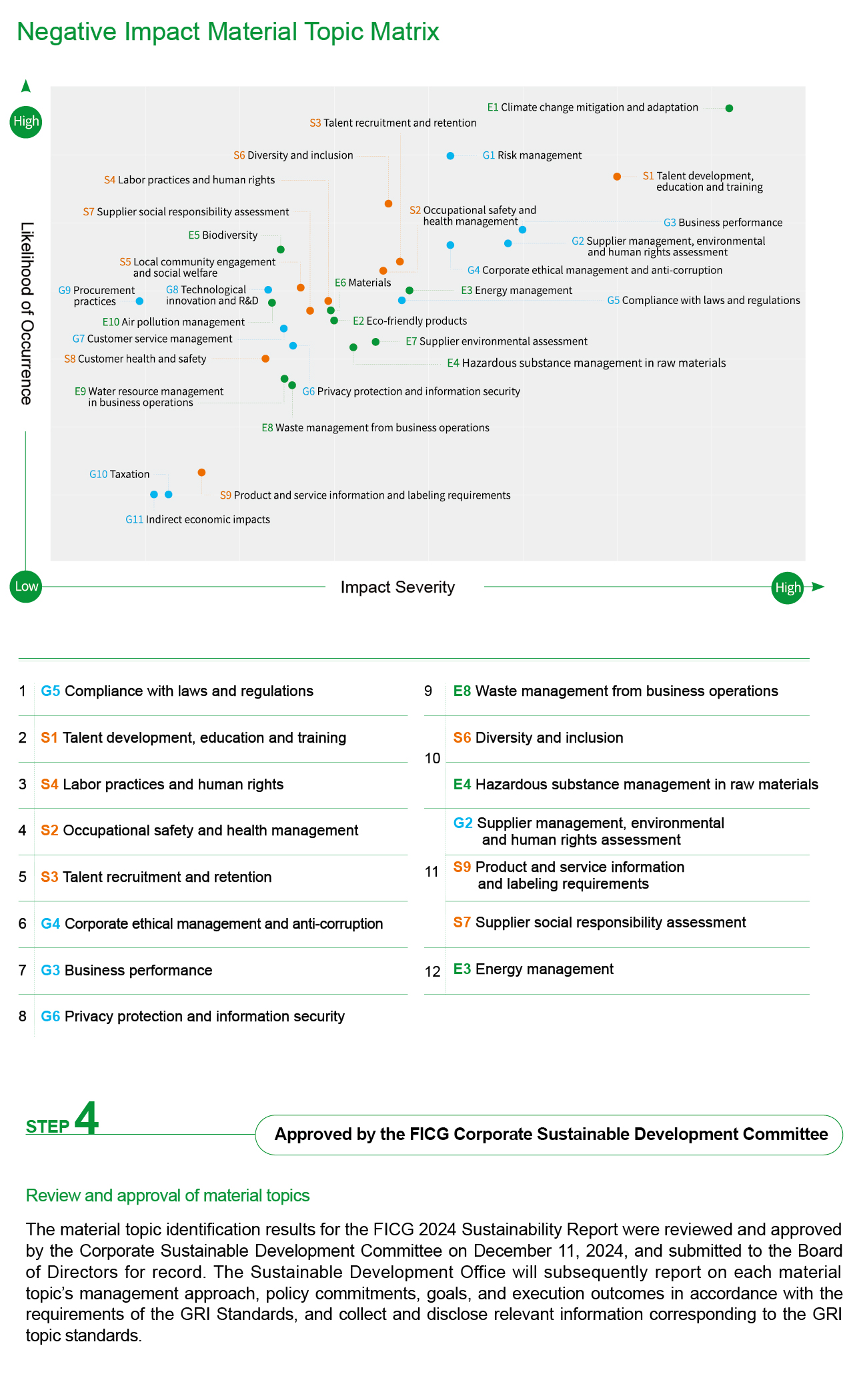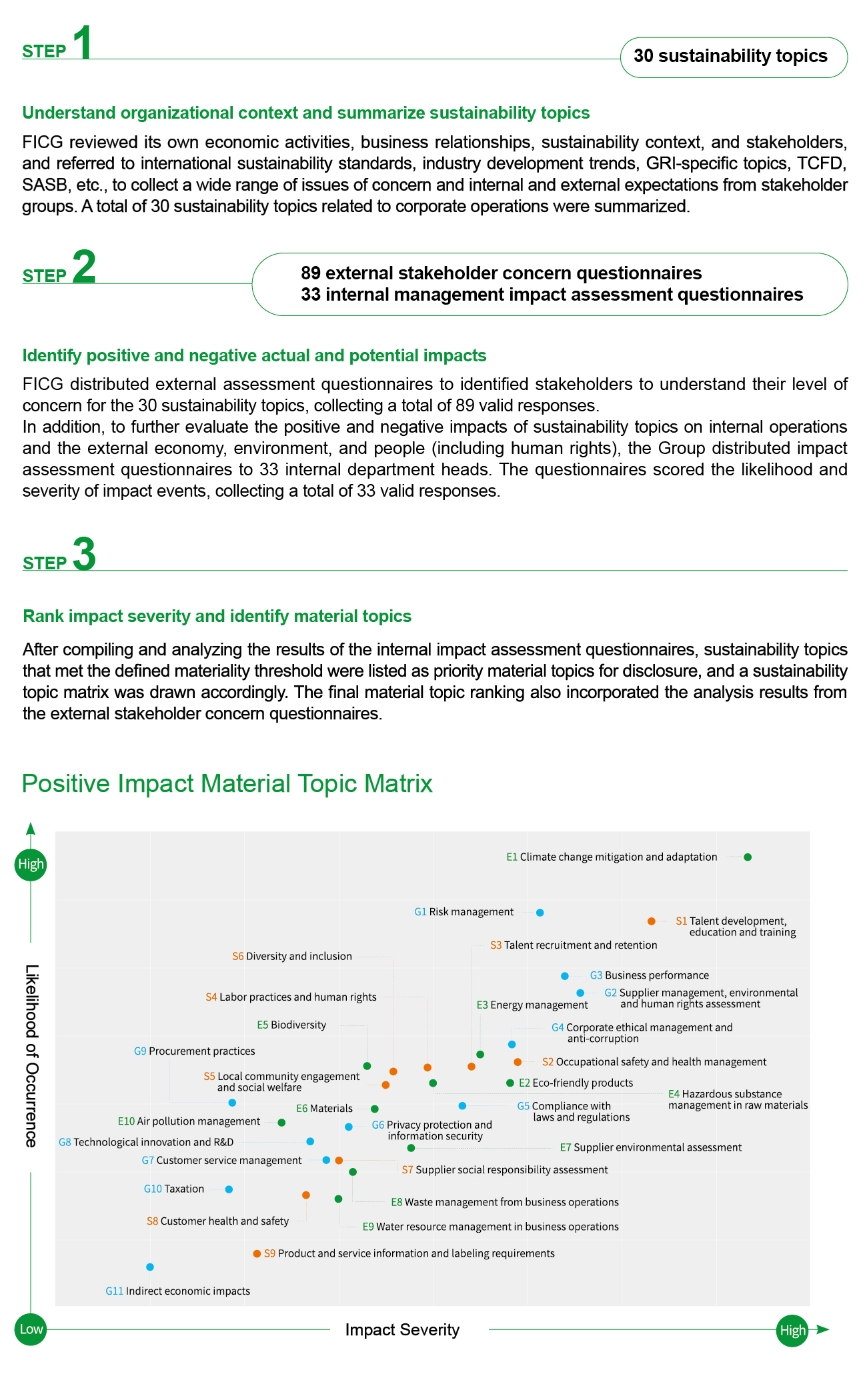 FICG refers to the GRI Sustainability Reporting Standards and AA1000 Accountability Principles Standards, using the four principles of inclusivity, materiality, responsiveness, and impact to identify material topics. In accordance with GRI Standards 2021, the impact of material topics on the economy, environment, and human rights is assessed. The results serve as the basis for formulating the Group’s sustainable development strategy.