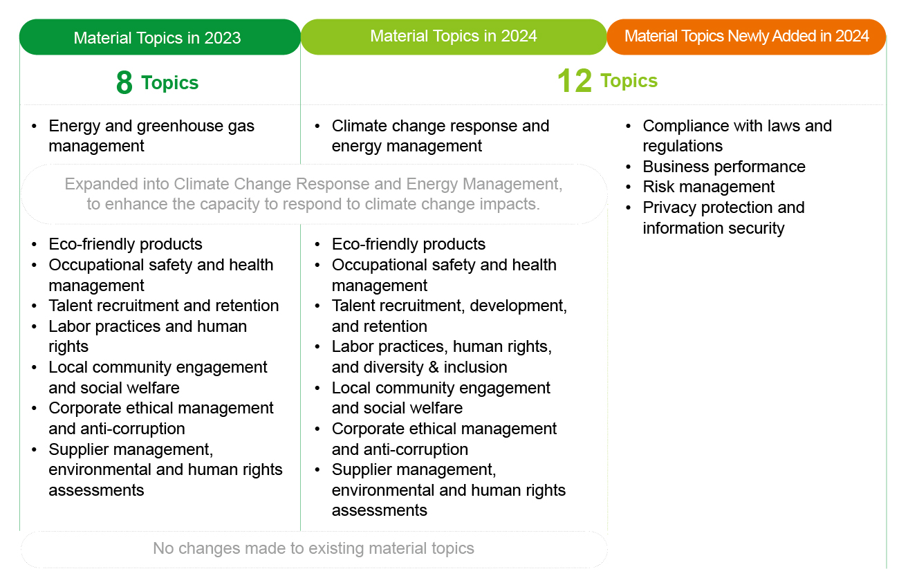 Compared with the eight material topics disclosed in the 2023 Sustainability Report, in 2024, the original “Energy Management and Greenhouse Gases” was expanded into “Climate Change Response and Energy Management.” Four new material topics were added: “Regulatory Compliance,” “Business Performance,” “Risk Management,” and “Privacy Protection and Information Security.”