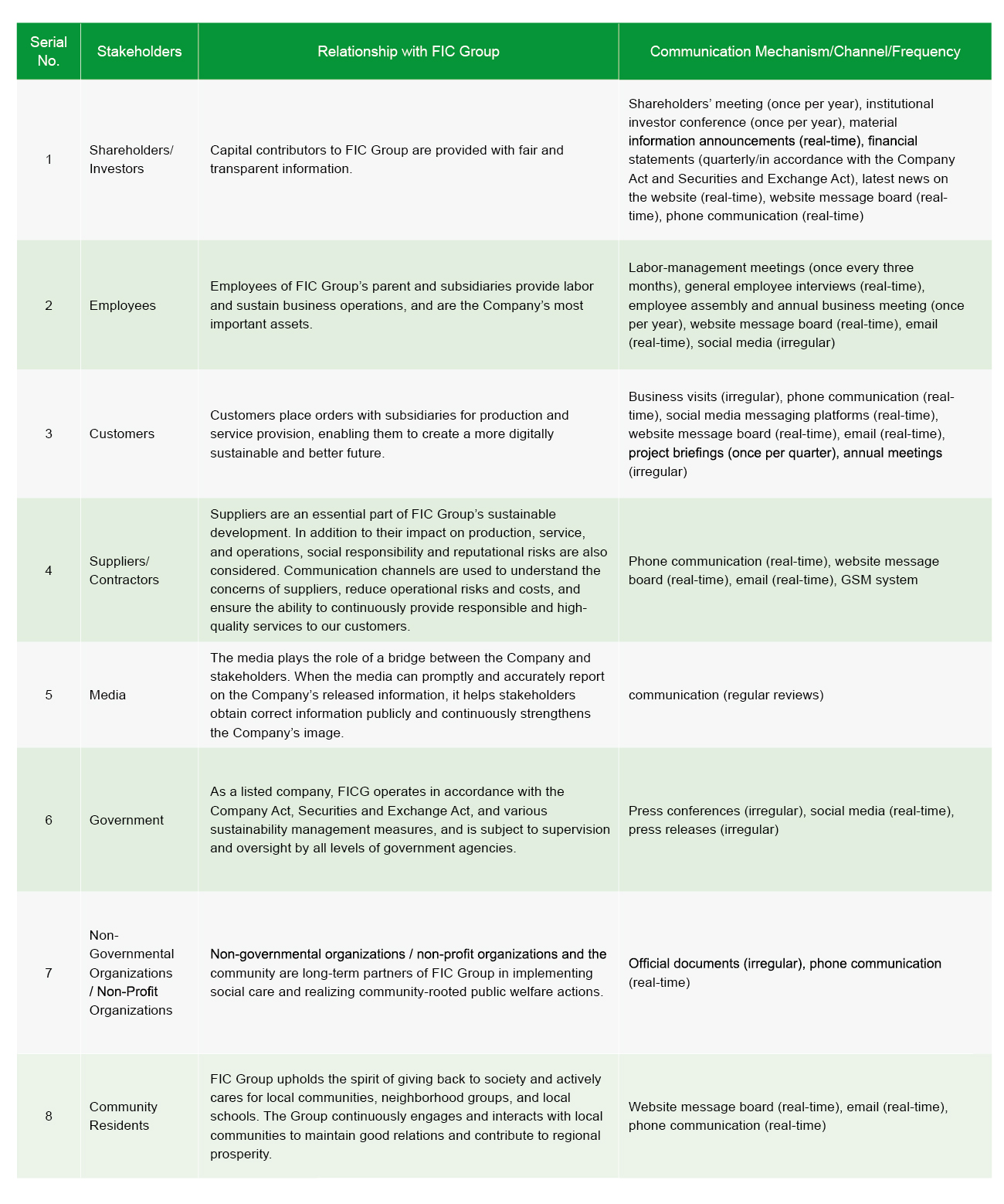 FICG communicates with stakeholders via multiple means such as physical channels and online questions. The purpose is to understand the level of emphasis placed by stakeholders on each sustainability issues and the influence on their evaluation and decision making. There are eight categories of major stakeholders, i.e., shareholders/investors,employees, customers, suppliers/contractors, media, government, non-government organizations/non-profit organizations and community residents. The results of communication with stakeholders in 2024 are described below: