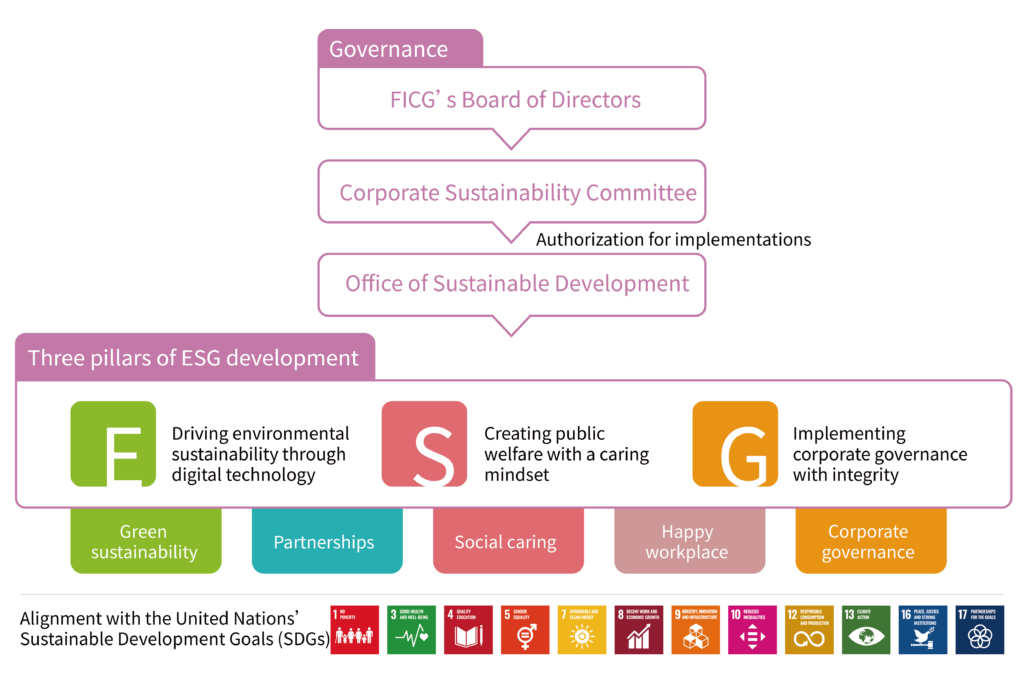In 2022, FICG’s Board of Directors established Corporate Sustainability Committee as the highest management organization for planning and supervision of sustainable development strategies. Chairman of the Board of Directors, Chien Leo Ming-Tz, serves as Chair of Corporate Sustainability Committee and assigns the Office of Sustainable Development five projects, namely, corporate governance, happy workplace, partnerships, green sustainability and social caring. Targets are set each year based on the disclosed important issues. Two meetings were held in 2023. Implementation progress is reported to the Board of Directors in order to achieve the short-term, medium-term and long-term goals of corporate sustainability development.