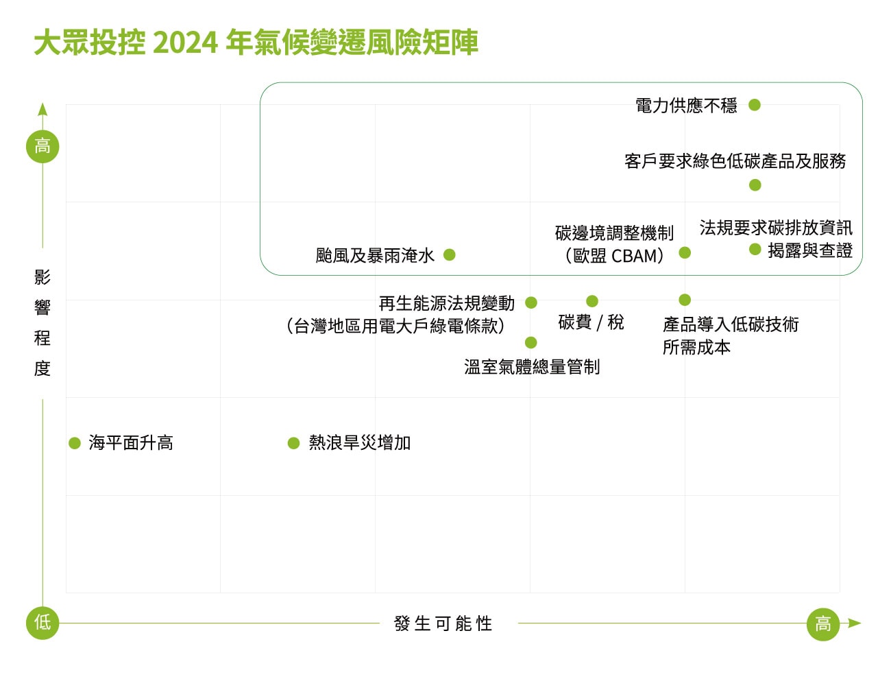 根據上述分析結果,鑑別出發生可能性與影響程度均較高之前五大氣候風險議題(颱風及暴雨淹水、歐盟CBAM碳邊境調整機制、法規要求碳排放資訊揭露與查驗證、客戶要求綠色低碳產品及服務、電力供應不穩)與前五大氣候機會議題(提升能源使用效率、導入再生能源發電、研發符合低碳永續需求之新產品、環境永續有助企業融資、調整供應鏈以減少或分散氣候相關風險),並據此繪製氣候變遷風險矩陣以及機會矩陣。