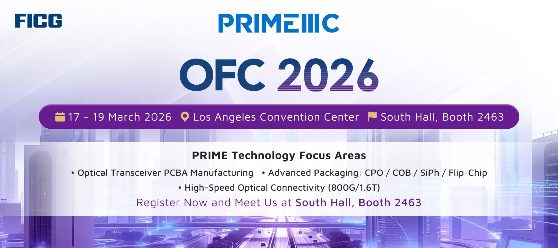 2026 年,FICG將參加於美國洛杉磯舉辦的 OFC 光纖通訊研討會暨展覽會,展示完整的高速光收發模組製造與先進封裝解決方案。我們將重點呈現高精密 PCBA製造、CPO / SiPh / Flip-Chip先進封裝能力,以及跨世代產品的量產支援,協助客戶因應高速傳輸、AI 光互連架構與新一代資料中心應用日益成長的需求。